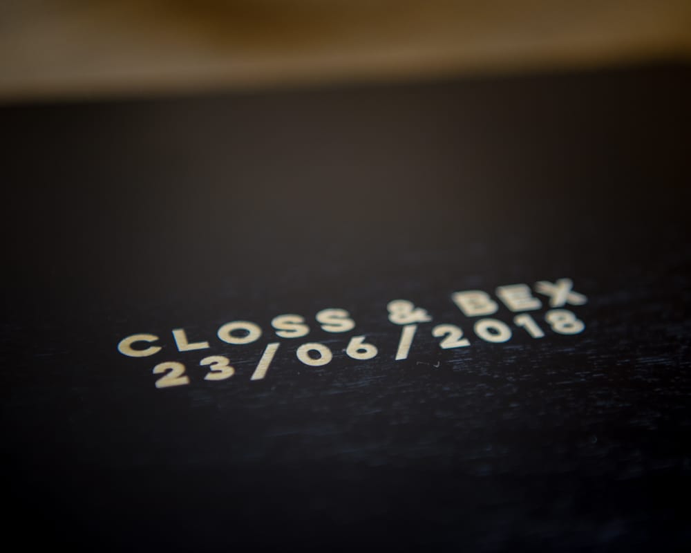 A dark wooden box with your name and wedding date etched on the lid, secured with a metal clasp.